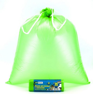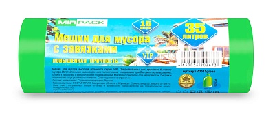 Пакеты для мусора с завязками 35 л, 15 мкм, 15 шт, ПНД, зеленые, VIP